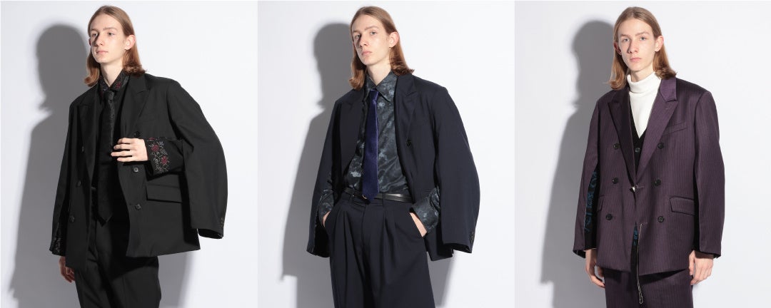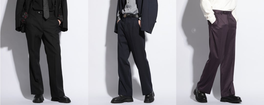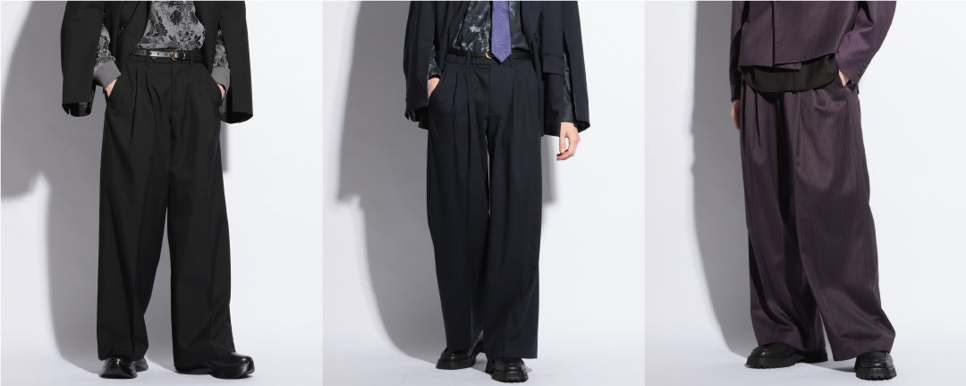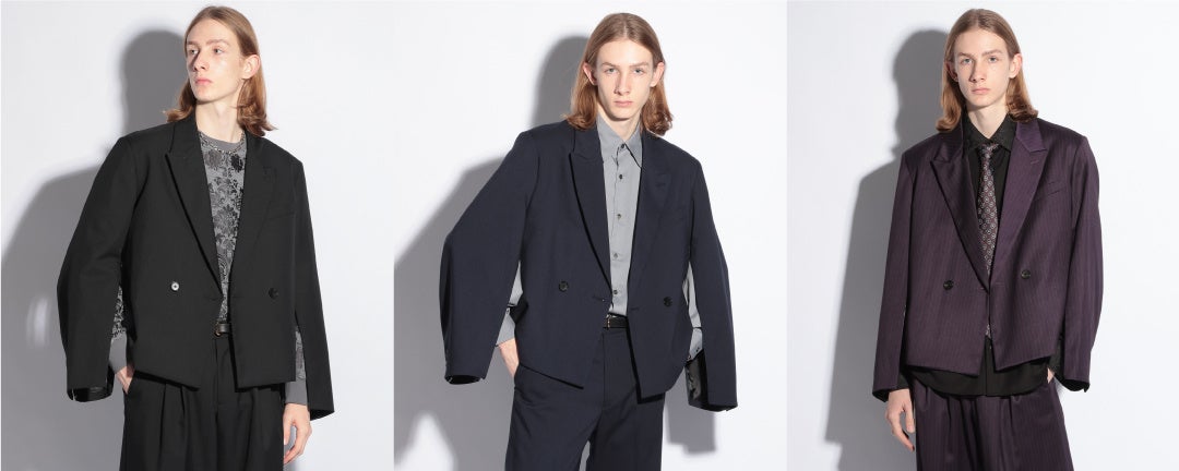 メンズアイテムは、HAREで定評のあるセットアップを、ホリデーシーズンのイベントや成人式など、活躍の機会が増える季節に合わせてアップデート。より多くのお客様に向けて、シーンや好み次第で自由に組み合わせが可能な “同じ素材で仕立てたデザイン違い” のダブルジャケット、ショートジャケット、ワイドパンツ、ストレートパンツの4型をラインアップしました。上質なウール混紡の生地を使用し、ジャケットはアーム下のコンシールファスナーによるシルエットの変化、パンツはエバークリース加工による半永久的なセンタープレスの実現など、トレンドの着こなしからフォーマルな着こなしまで様々なシーンで活躍する商品ラインアップに仕上げました。