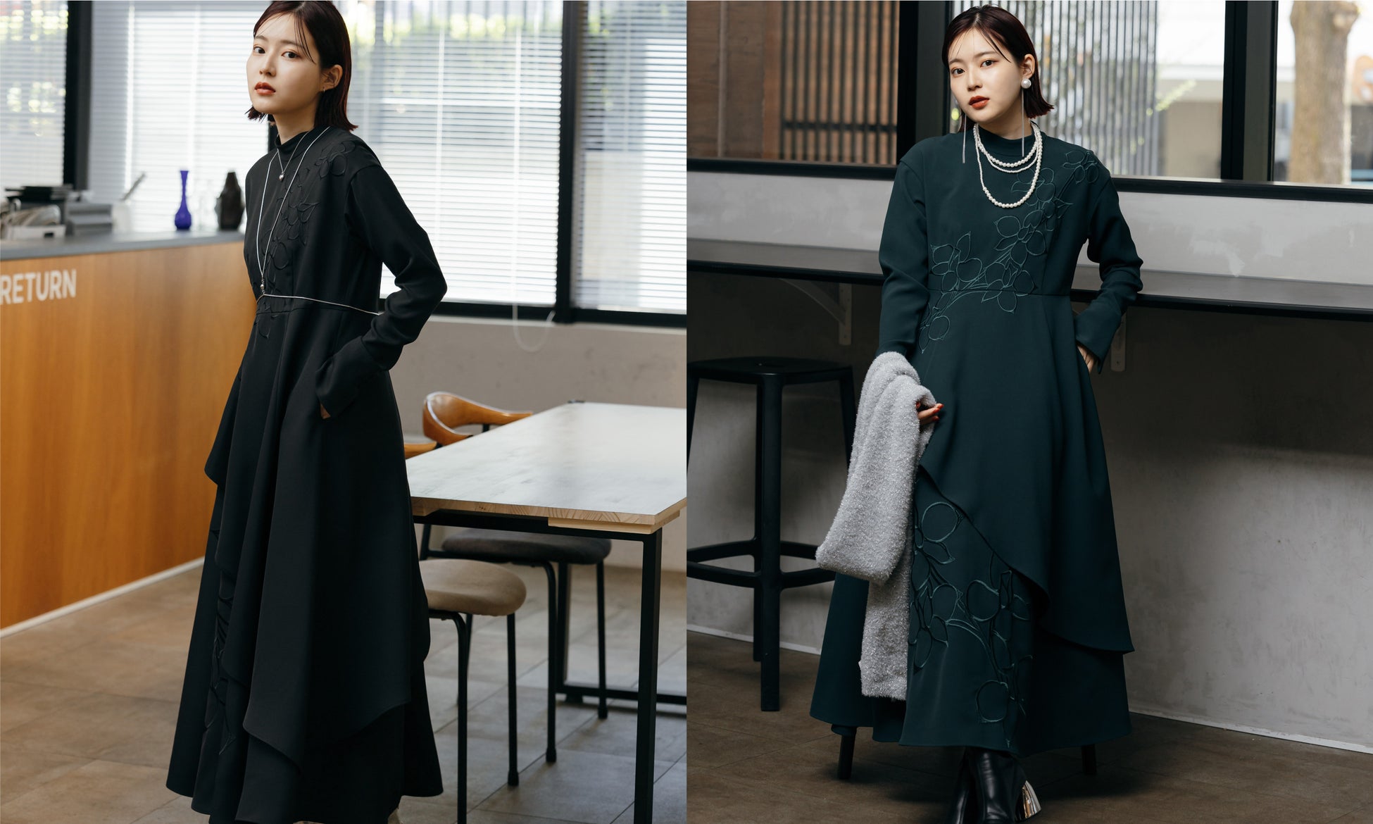花柄の刺繍とドレープがポイントのワンピース。1枚でハレの日の装いが決まるリュクスな存在感で、レストランデートにも対応。長め丈でスタイルアップ見えも。