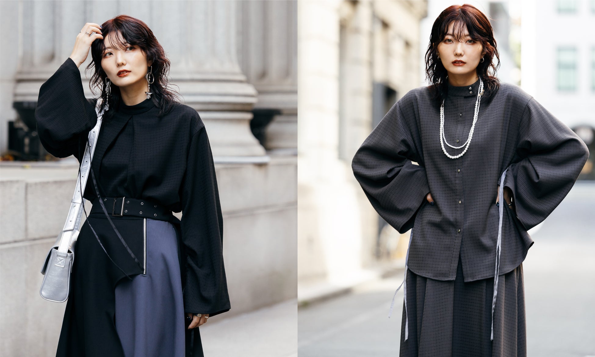 太めのタックやボリュームあるフレアスリーブなど、細部までこだわったシャツ。シルエットに変化が生まれるからシンプルなのに単調に見えない。2wayとしてボタンを前で着ればよりシンプルな表情にも。