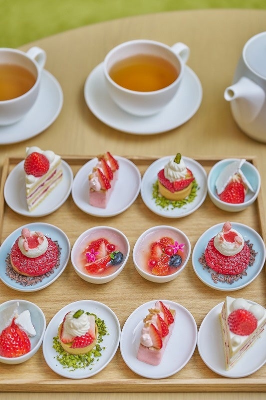 ストロベリーショートケーキやピスタチオとストロベリーのタルトといった、春を先取りした色鮮やかな6種類のスイーツと、和牛のラグーとほうれん草のキッシュやヴォロヴァン、ドライストロベリー、塩キャラメル、クリームチーズなど、フレンチのエッセンスを取り入れた4種類のセイボリーが揃います。銀座の中心にありながら喧騒を忘れるようなグリーンを基調とした穏やかな空間で、甘い香りに包まれる至福のひと時をお楽しみください。