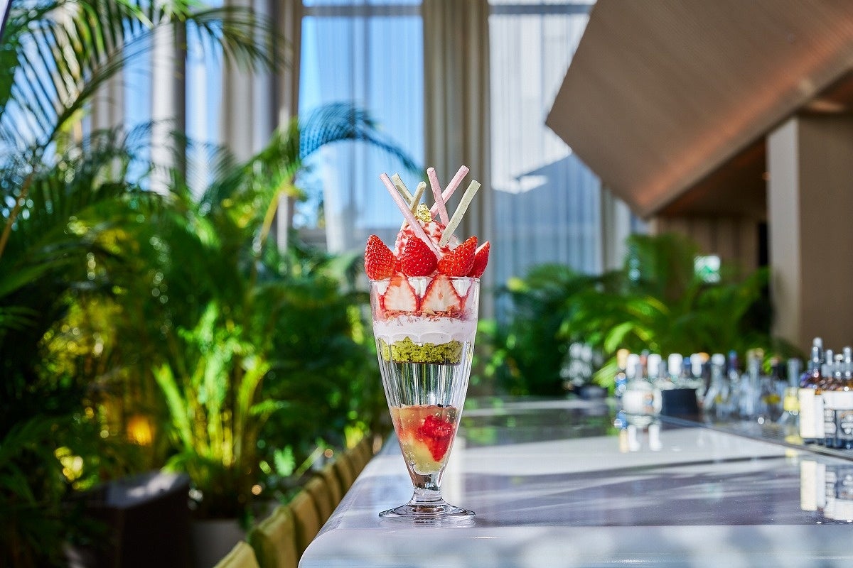 旬の苺を使った、Lobby Barのシーズナルパフェ。苺ソースをかけた練乳クリームのまわりにフレッシュ苺をたっぷり並べ、グラスの中央には苺のシャーベットを忍ばせました。下の層には、苺のフィアンティーヌ、苺のシャンティクリーム、ピスタチオスポンジとビターチョコレートが続きます。グラスの底に配した、カモミールティーゼリーとミックスベリーが後味をさっぱりと仕上げます。