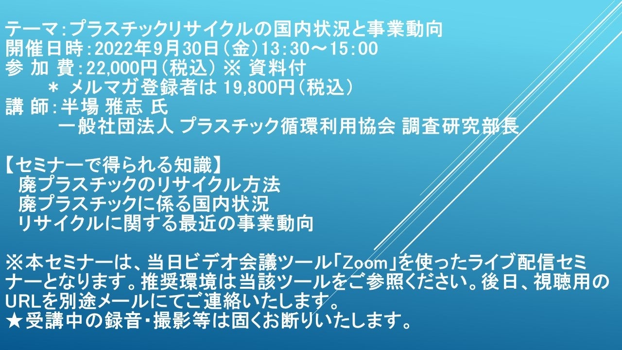 先端技術情報や市場情報を提供している(株)シーエムシー・リサーチ(千代田区神田錦町: https://cmcre.com/ )では、 各種材料・化学品などの市場動向・技術動向のセミナーや書籍発行を行っておりますが、 このたび「プラスチックリサイクルの国内状況と事業動向」と題するセミナーを、 講師に半場 雅志 氏 一般社団法人 プラスチック循環利用協会 調査研究部長)をお迎えし、2022年9月30日(金)13:30より、 ZOOMを利用したライブ配信で開催いたします。 受講料は、 一般:22,000円(税込)、 弊社メルマガ会員:19,800円(税込)、 アカデミック価格は<アカ>となっております(資料付)。