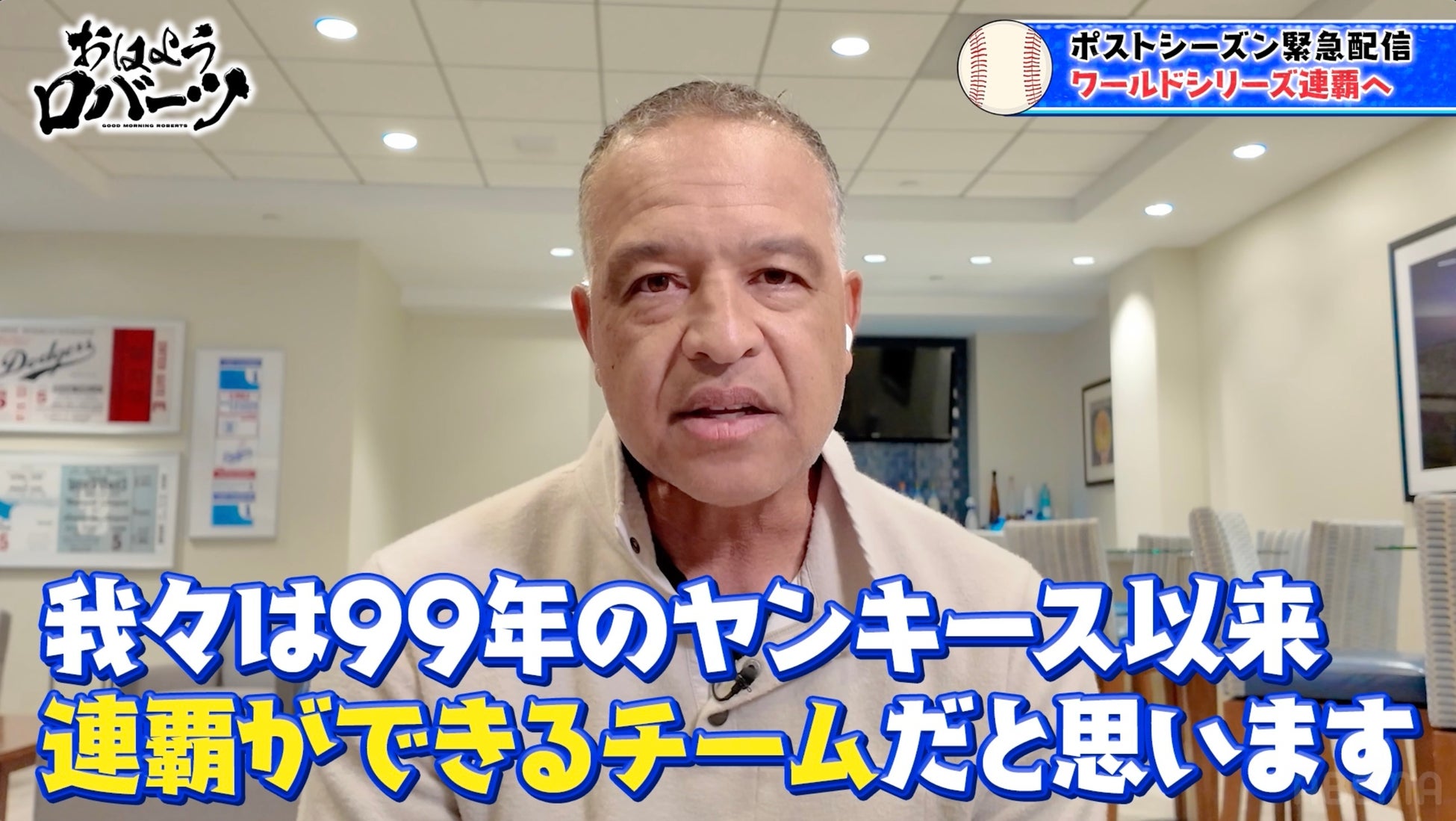 インタビュー終盤では「怪我が多かったので、私にとって一番厳しいシーズンでした」と、2025年シーズンを振り返ったロバーツ監督。一方で「それでも満足のいくシーズンでした。私はこのチームが本当に大好きです。チームは今最高の野球が出来ているので嬉しい」と、逆境を乗り越えてきたチームへの愛情をにじませました。そして、ワールドシリーズ連覇をかけた挑戦について、ロバーツ監督は「我々には歴史をつくるチャンスがあります」と語り、「今チームは素晴らしい野球をしている」「我々は99年のヤンキース以来、連覇ができるチームだと思います」と、自信と覚悟を明言しました。