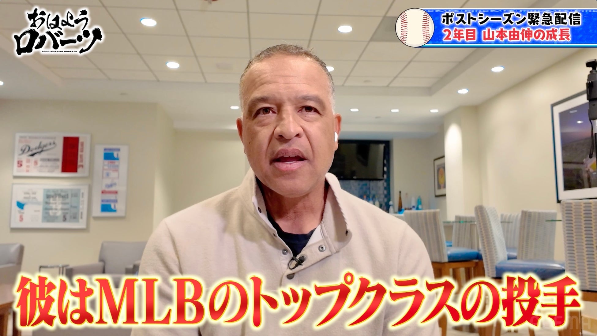 また、今季を通して安定した成績を残し、9月の防御率は0点台を記録するなどチームの勝利に大きく貢献した山本由伸選手について、ロバーツ監督は「自信が増しているのがわかりました」「彼はMLBのトップクラスの投手」と絶賛。「1年中ケガ人が多かった中、由伸の安定感は抜群でした。重要な試合の多くを勝利に導いてくれた」「今年は彼がポストシーズンで4勝するのを楽しみにしている」と、真のエースとしての期待値を語りました。