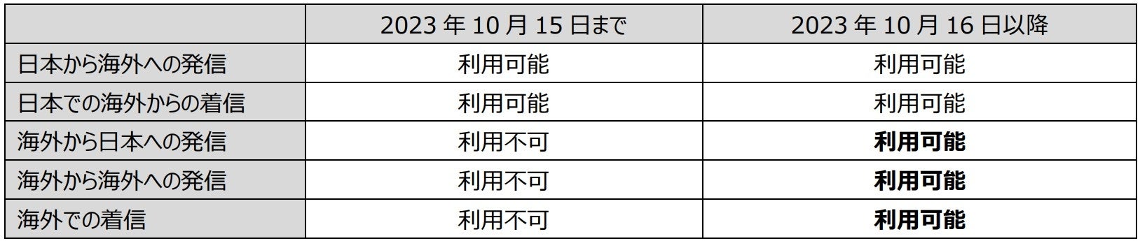 (注4)2023年10月13日以前に開通いただいた回線は、2023年10月18日以降、順次海外での国際通話・国際SMSがご利用可能となります。2023年10月14日以降に開通いただいた回線は、開通後すぐに海外での国際通話・国際SMSがご利用可能です。