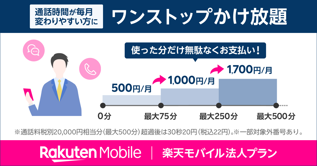「ワンストップかけ放題」は、「楽天モバイル法人プラン」公式サイトにおいてお申し込みが可能で、月によって月間の通話時間が異なるお客様向けのオプションサービスです。月間の国内通話時間に応じて料金が自動で変わる段階制料金となり、最大75分までの通話なら月額550円(税込)、最大250分までの通話なら月額1,100円(税込)、最大500分までの通話なら月額1,870円(税込)でご利用いただけます。500分超過後は30秒20円(税込22円)の通話料が発生します。また、OS標準アプリを使用した国内でのSMSを無制限でご利用いただけます(注5)。