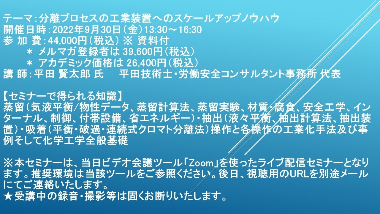 先端技術情報や市場情報を提供している(株)シーエムシー・リサーチ(千代田区神田錦町: https://cmcre.com/ )では、 各種材料・化学品などの市場動向・技術動向のセミナーや書籍発行を行っておりますが、 このたび「分離プロセスの工業装置へのスケールアップノウハウ」と題するセミナーを、 講師に平田 賢太郎 氏 平田技術士・労働安全コンサルタント事務所 代表)をお迎えし、2022年9月30日(金)13:30より、 ZOOMを利用したライブ配信で開催いたします。 受講料は、 一般:44,000円(税込)、 弊社メルマガ会員:39,600円(税込)、 アカデミック価格は26,400円(税込)となっております(資料付)。