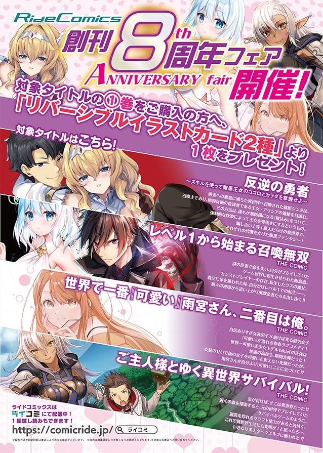 ライドコミックス創刊8周年を記念して、フェア実施店舗にて対象書籍1巻をご購入につき、8周年のお祝いの描き下ろし両面イラストカードをプレゼントいたします。