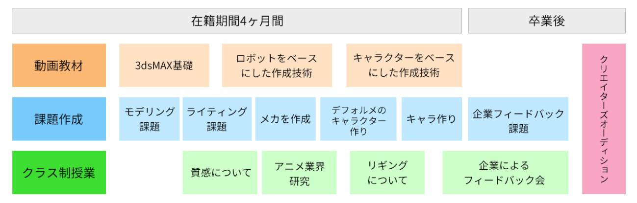 4ヶ月間で基本的なソフトの使い方から、就職転職に活用できるキャラクターモデル制作まで、いつでもどこでも視聴可能な映像教材をベースにマンツーマンで指導いたします。