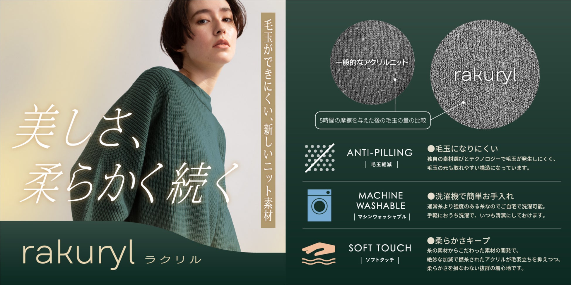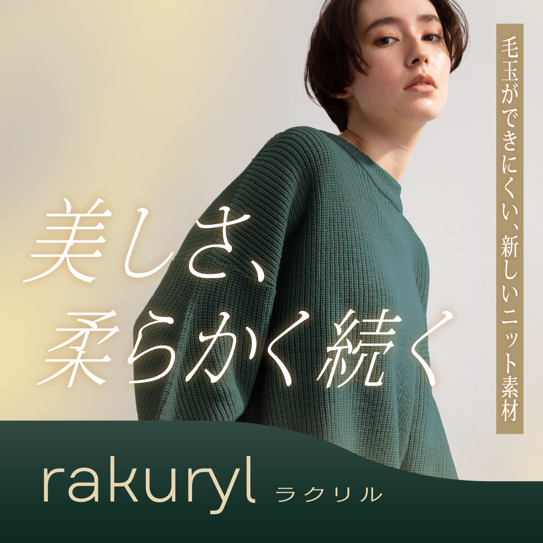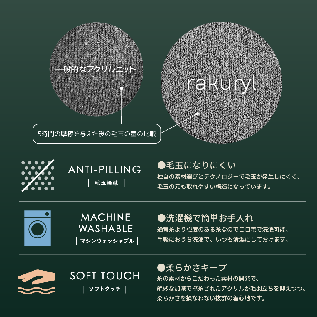 冬の定番素材であるアクリルニットは柔らかく、よく膨らみ、暖かいことが特徴の素材ですが、生地表面の毛羽が乱れ、絡まってしまうことで毛玉になりやすい素材でした。ラクリルは粘度の低いアクリル原料を使用することで、風合いは柔らかいままアンチピリング(毛玉になりにくい)素材を目指して開発されました。