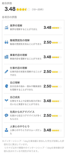 『インターンシップ・1day仕事体験評価』機能も6月1日から公開します。当社には以前より、就職準備に臨む学生から、インターンシップや1day仕事体験を探す際、同期学生や先輩が行った評価を参考にしたいという声が寄せられていました。この学生の声を受け、限られた時間の中で、学生が自分に合ったプログラムを探す新たな軸として本機能を搭載しております。学生からの投稿は6月1日から可能となり、各企業のインターンシップ・1day仕事体験の評価は6月1日よりサイト上にて公開いたします。学生が評価を投稿できるのは、事前にエントリーし、プログラムを体験した『リクナビ2025』に掲載する全ての企業のインターンシップ・1day仕事体験が対象です。学生は参加したプログラムについて、「総合評価」に加え、「業界の理解」「職場雰囲気の理解」「事業内容の理解」「仕事内容の理解」「自己理解」「自己成長」「社員からのアドバイス」「人事とのやりとり」の8項目、計9項目を5段階で評価します。項目ごとに入力された数値は独自ロジックで集計され、9項目それぞれの項目において、投稿した学生全体の評価として評価値が算出されます。