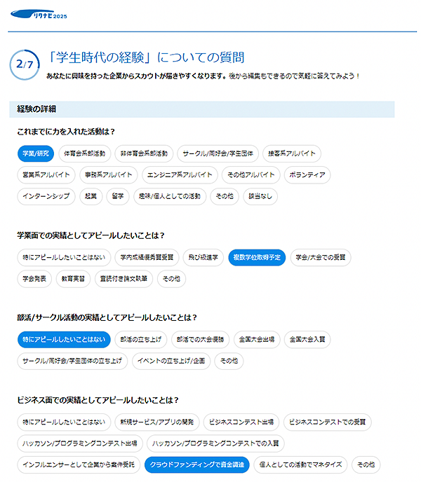 登録するスキルや経験項目は、「学業について」「学生時代の経験」「資格」「スキル」「希望勤務地域」「仕事に対する価値観」「志望志向」の7つのカテゴリーになります。