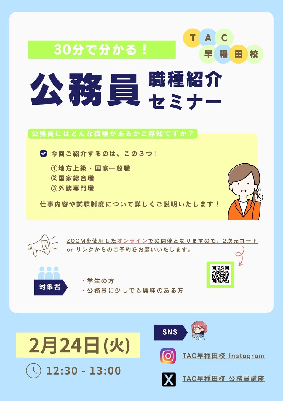 【TAC公務員】「30分で分かる!公務員の職種紹介セミナー」を2/24(火)に配信します!