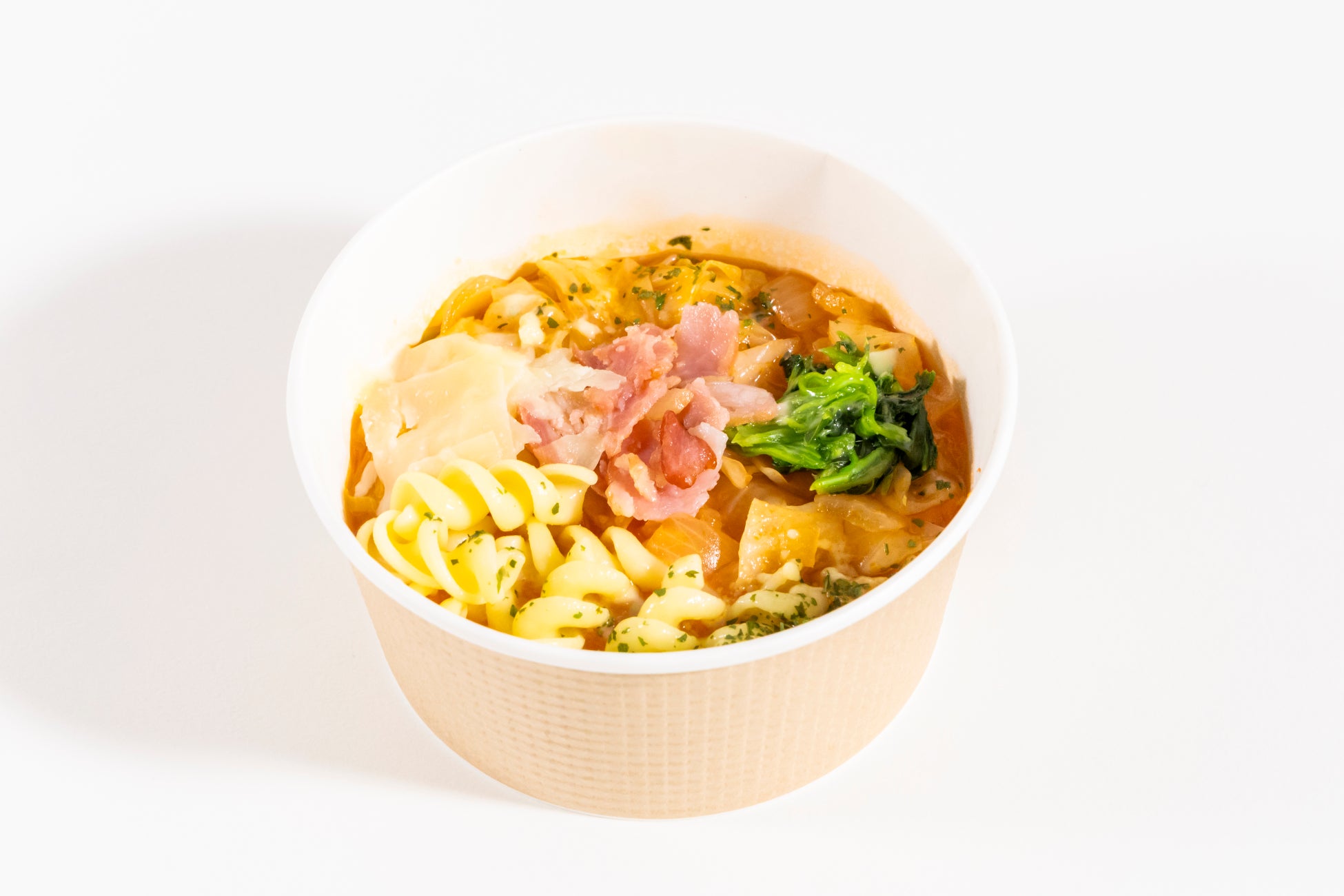 【内容】トマトソースをベースにミルクでコク、チキンブイヨンで鶏の旨みを効かせ、酸味・コク・旨みをバランス良く仕立てたスープです。具材には、ベーコンや野菜に加えてスープがらみの良いフジリ(パスタ)を使用しています。