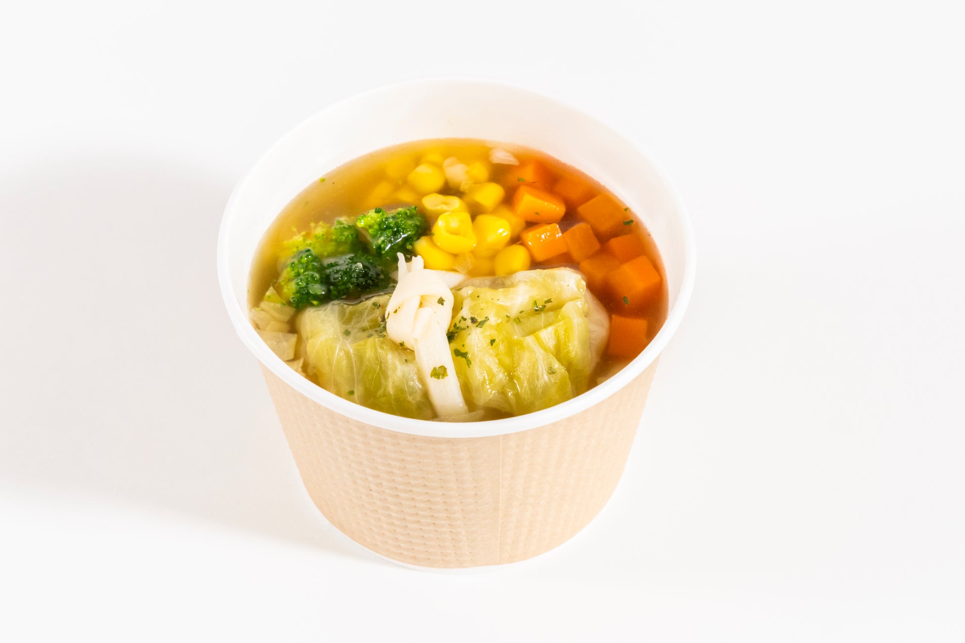 【内容】ロールキャベツを使用した食べ応えのあるスープです。チキンとビーフコンソメをベースに野菜やハーブの風味を効かせた仕立てで、具材には人参、コーン、ブロッコリーなどを使用しています。