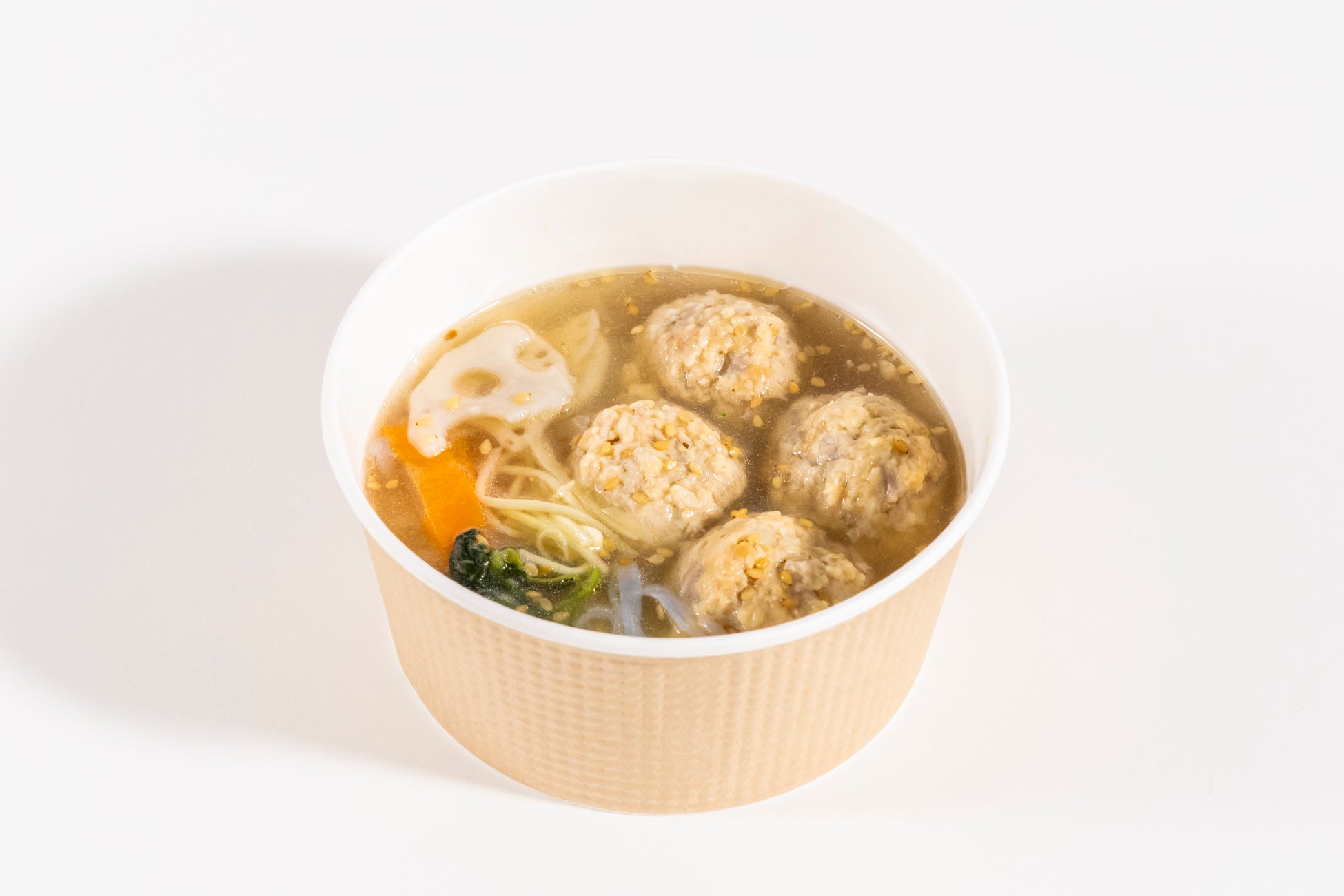 【内容】つくねを使用した鶏、白だしベースの和風スープです。メイン具材のつくねは豆腐でふんわり感、れんこんでシャキシャキ食感を加えています。具材には、春雨、大根、人参、ほうれん草などを使用しています。