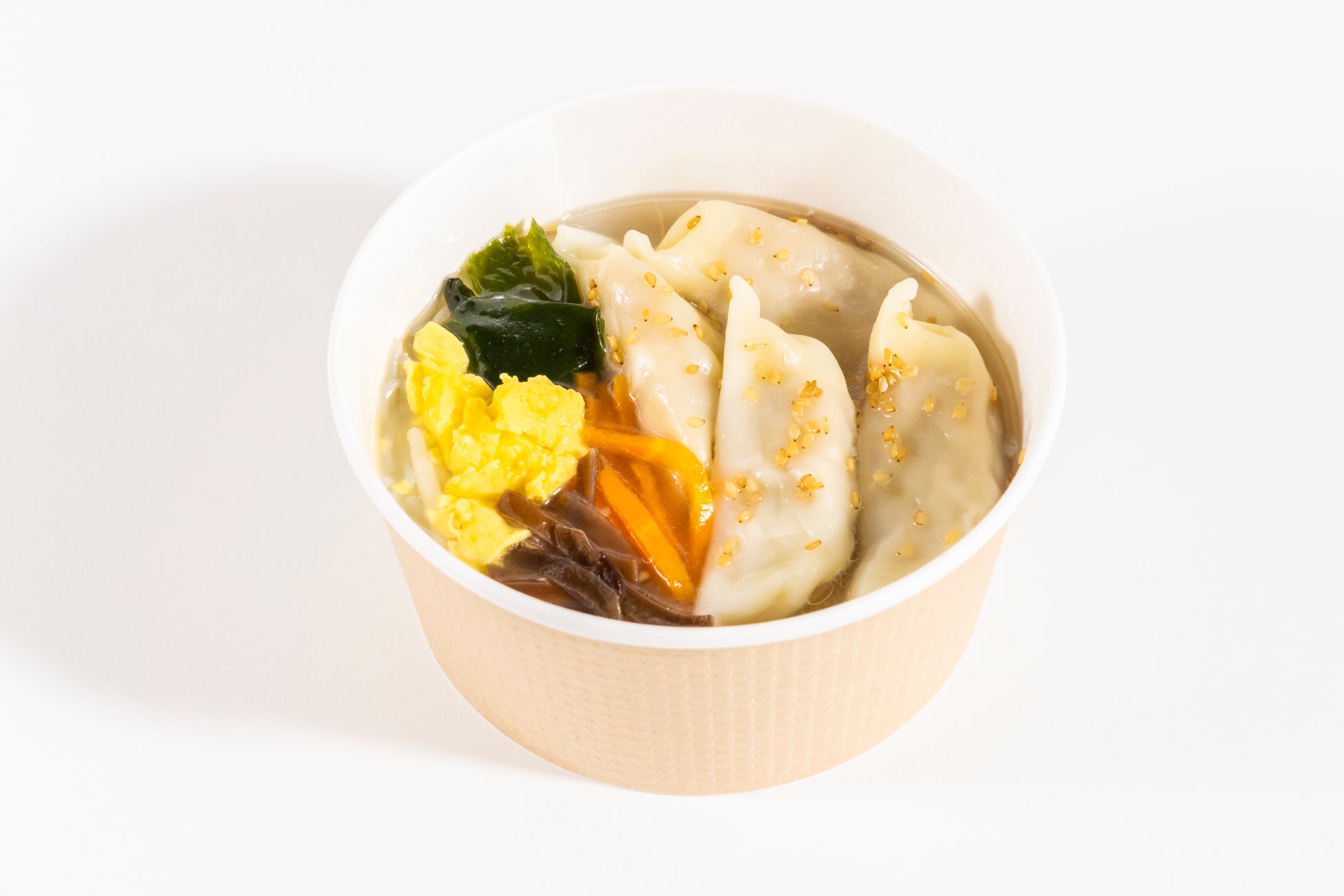 【内容】もちもち食感の水餃子が4つ入った食べ応えのある中華スープです。鶏の旨みと香味野菜の風味の効いた仕立てで、具材には餃子をメインに春雨、人参、かき玉子などを使用し彩り良く仕立てています。