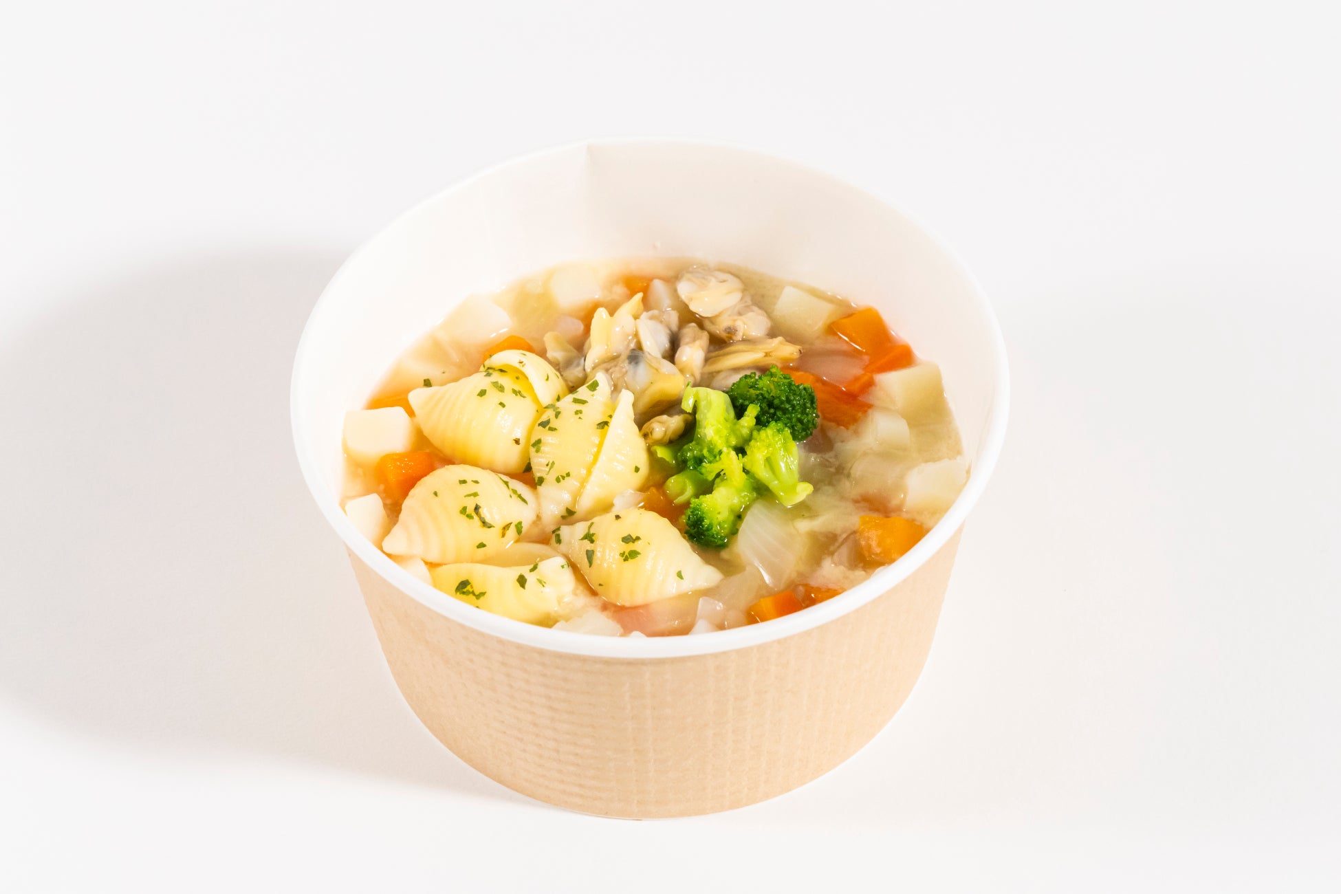 【内容】濃厚なあさりの旨みに加えて、クリームのコクや野菜の風味をきかせたクラムチャウダーです。具材には、あさり、ポテト、野菜の他にシェルマカロニを使用した、ボリューム感のある仕立てです。