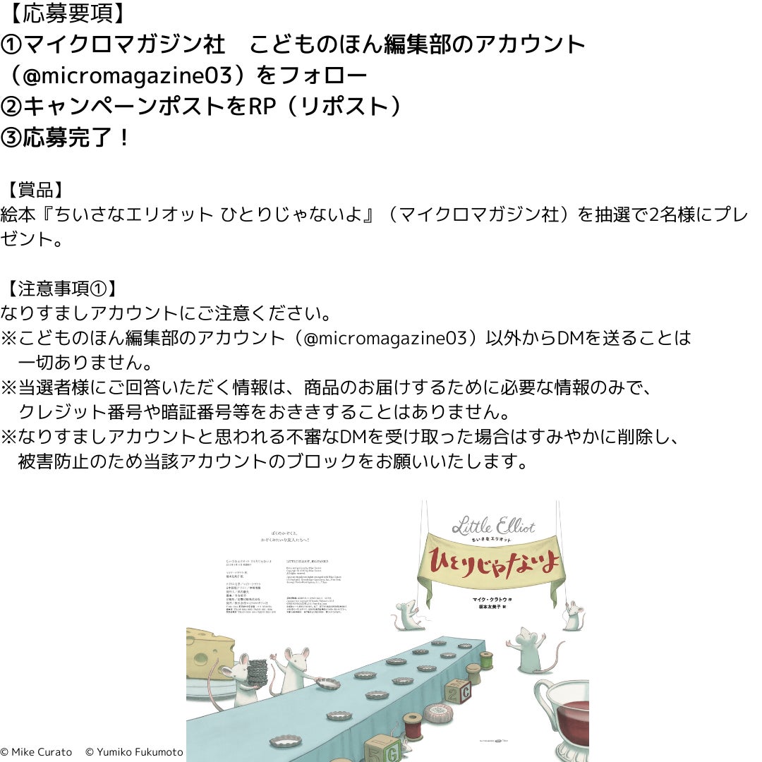 フォロー&リポスト(Instagramではいいね)をされた方から、抽選で2名様に絵本『ちいさなエリオット ひとりじゃないよ』とをプレゼント!
