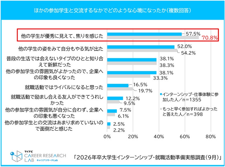 9月のインターンシップ・仕事体験参加率は71.4%。参加学生の半数以上が「他の学生が優秀に見え、焦りを感じた」と回答。参加後に企業への志望度が上がったと回答したのは85.8%