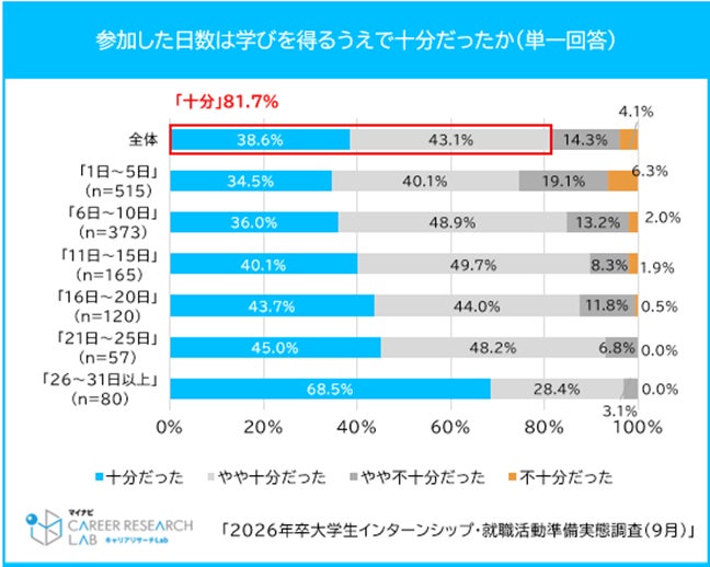 これまでに参加したインターンシップ・仕事体験の合計日数で、最も多かったのは「1日~5日」で35.9%となった。また、参加した日数は学びを得るうえで十分だったかについて聞くと、81.7%が「十分だった(十分+やや十分)」と回答した。参加日数ごとにみると、参加日数が長いほど「十分」と回答している学生の割合が多い。学生によって参加した日数に違いがありつつも、8割以上の学生が、参加日数は十分だと感じていることがわかる。【図5、6】