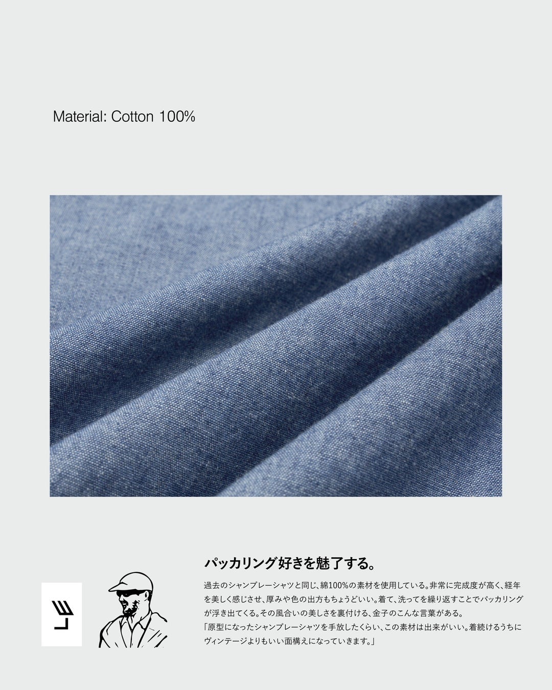 過去のシャンブレーシャツと同じ、綿100%の素材を使用している。非常に完成度が高く、経年を美しく感じさせ、厚みや色の出方もちょうどいい。着て、洗ってを繰り返すことでパッカリングが浮き出てくる。その風合いの美しさを裏付ける、金子のこんな言葉がある。