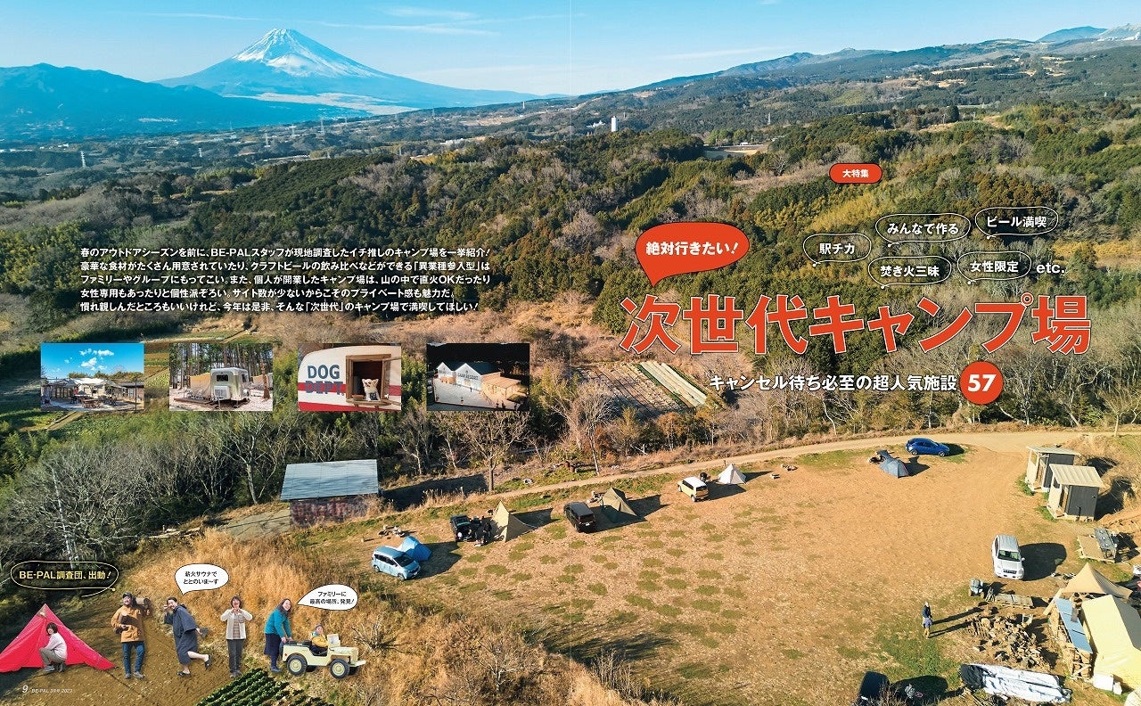 さらに、今号の大特集は「絶対行きたい! 次世代キャンプ場」。全国で急増中のキャンプ場の中から、異業種参入や個人開業、廃校など遊休地を活用した施設など、一度は行ってみたいキャンプ場を厳選。冬キャンはもちろん、GWの予約にも大活躍。キャンセル待ち必至のキャンプ場ばかりなので、是非チェックしてみてください!