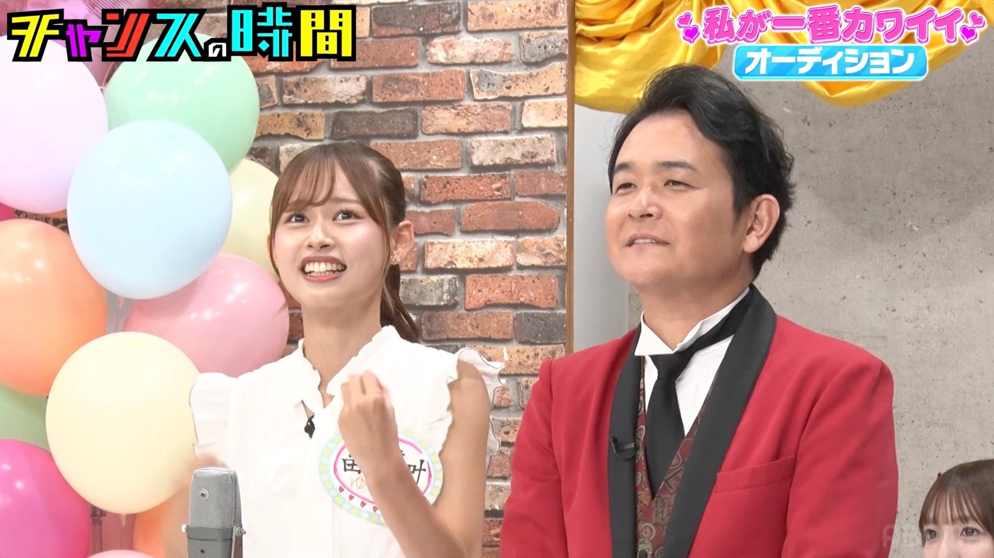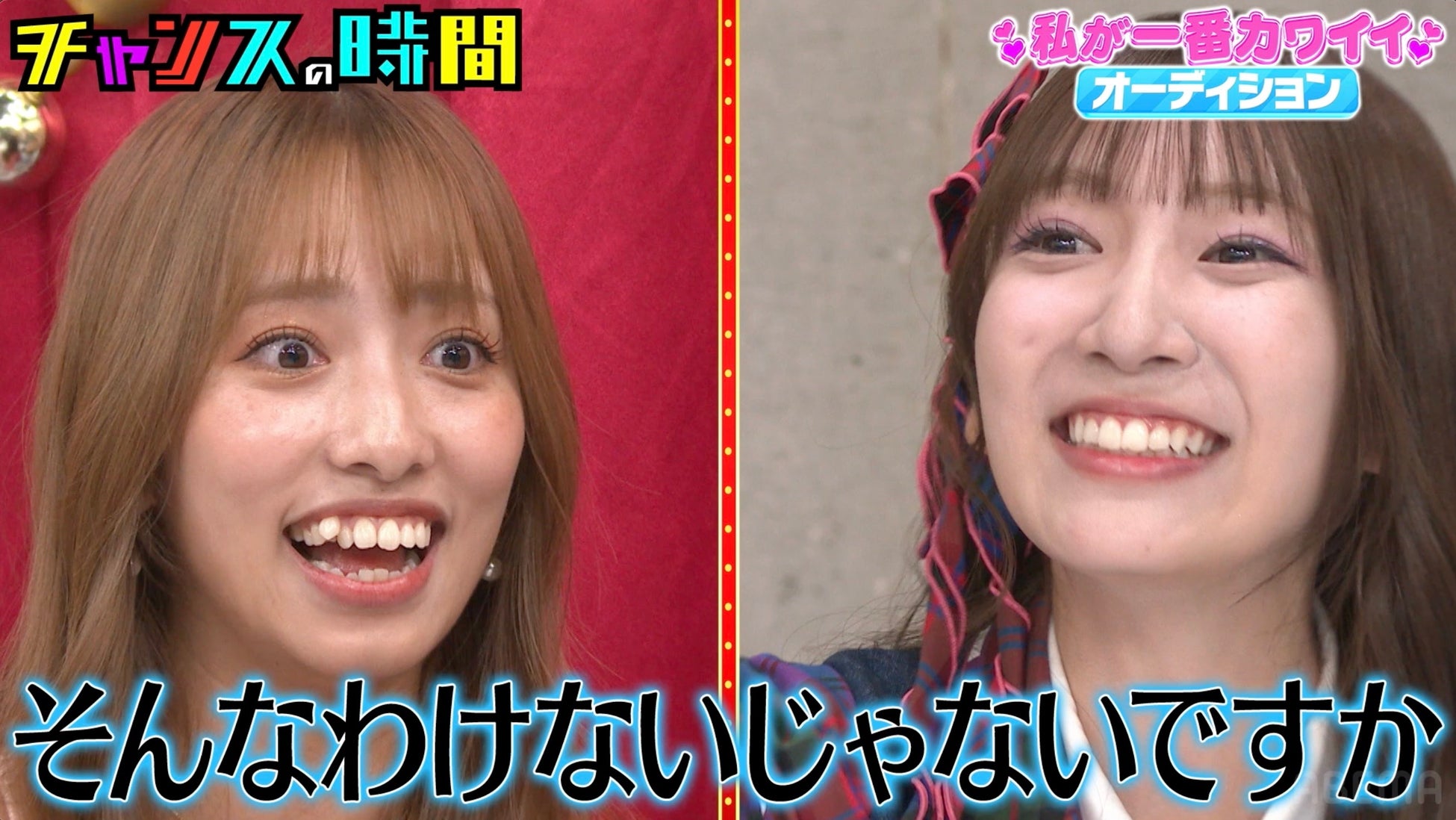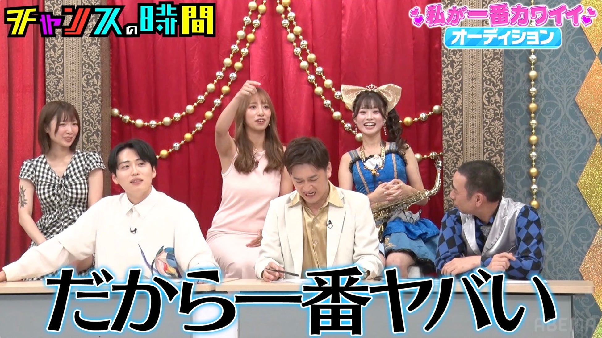 オーディション前半ブロックでは、今年研究生から正規メンバーに昇格したアイドルグループ・AKB48の工藤華純や、“ホリプロタレントスカウトキャラバン準グランプリ”受賞経験を持つタレント・畠中夢叶が登場。モテエピソードを披露する場面では、動物園に行った際に「私がかわいすぎてモルモットに嬉ションされた」「動物界でもカワイイを伝えられている」と語った工藤に、見届け人の高梨が「人からモテないから動物のエピソードしか喋れない」と指摘したことで女同士のマウント合戦に発展。「私ラクダに嬉ションされたことあります」と明かした高梨に対して、「嘘、嘘、絶対嘘!」と否定した工藤は、「セイウチにもキスしました」と別の動物エピソードも披露。「キスはセイウチしか知らない」とした工藤に、高梨は「そんなわけない」「一番男のニオイがする」と反論し、笑いを誘いました。さらに、“口の中に髪の毛が入ってしまった時の一言”というお題での工藤の回答に、ノブが「ド級の下ネタじゃない」とツッコミを入れ、高梨も「だから一番ヤバいんですよ!」と声を荒げる場面もありました。