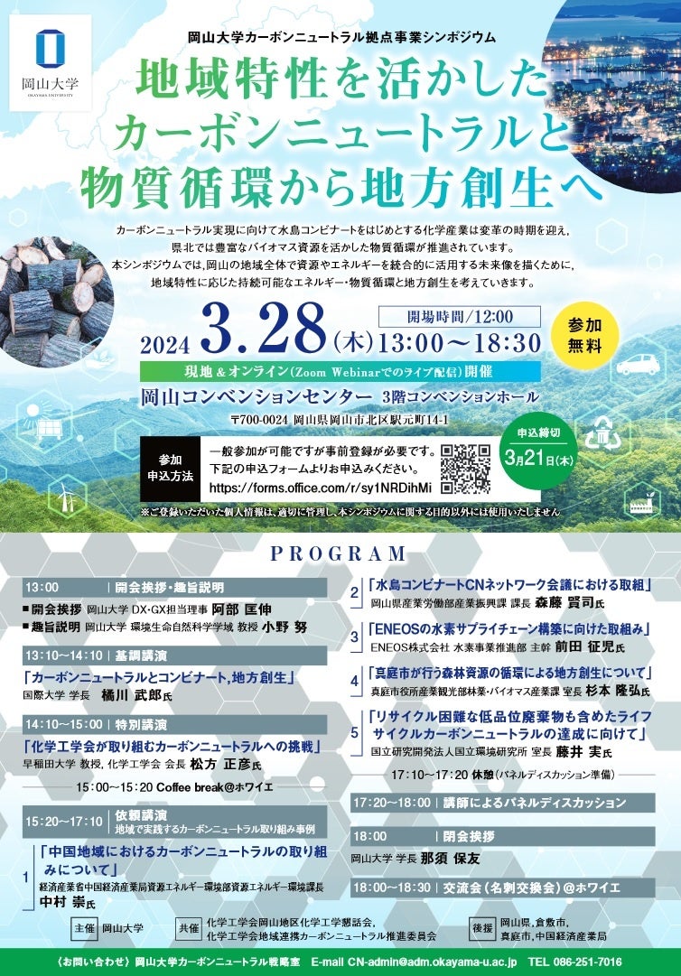 【岡山大学】岡山大学カーボンニュートラル拠点事業シンポジウム 「地域特性を活かしたカーボンニュートラルと物質循環から地方創生へ」〔3/28,木 ハイブリッド開催〕