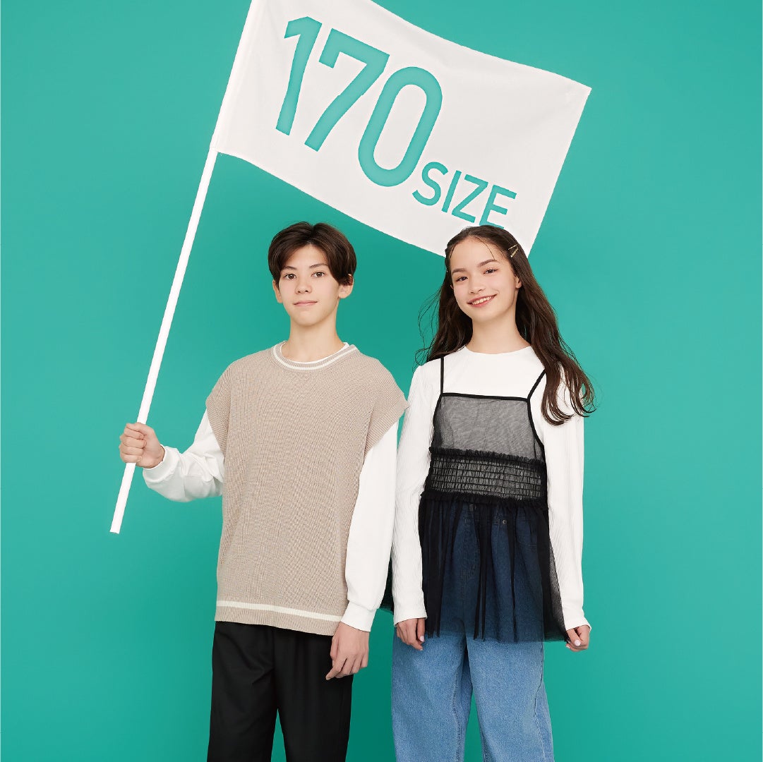 「もっとカラダが成長するかもしれないから大きなサイズを買っておきたい。」「トレンドの“ゆるテイスト”を楽しみたいから、あえてワンサイズ上を選びたい。」“子ども以上、オトナ未満”の子どもたちが抱える洋服のサイズ選びに対する悩みやご要望にお応えすべく、従来のサイズ展開を見直し、新しく170サイズが新登場し、キッズウエアは120~170サイズ展開となります。今回は、キッズウエアで展開している「ニットベストセット」や「キャミワンピース」など人気アイテムの大きいサイズを充実することで、子どもたちに好きなファッションを長く楽しんでいただきたい、という想いを込めています。今後、お客さまのご意見ご要望を伺いながら、全てのキッズウエア商品に170サイズを順次追加していく予定です。