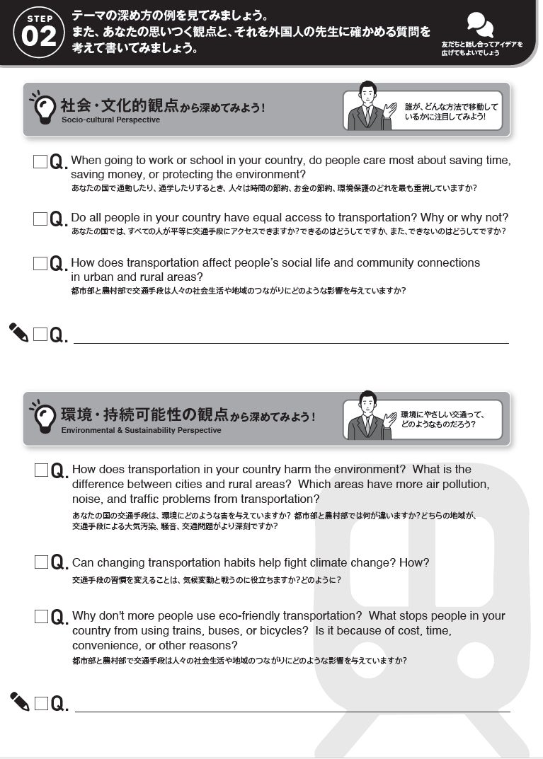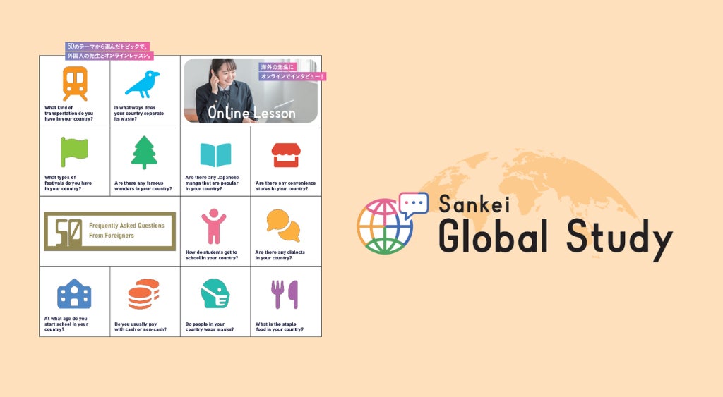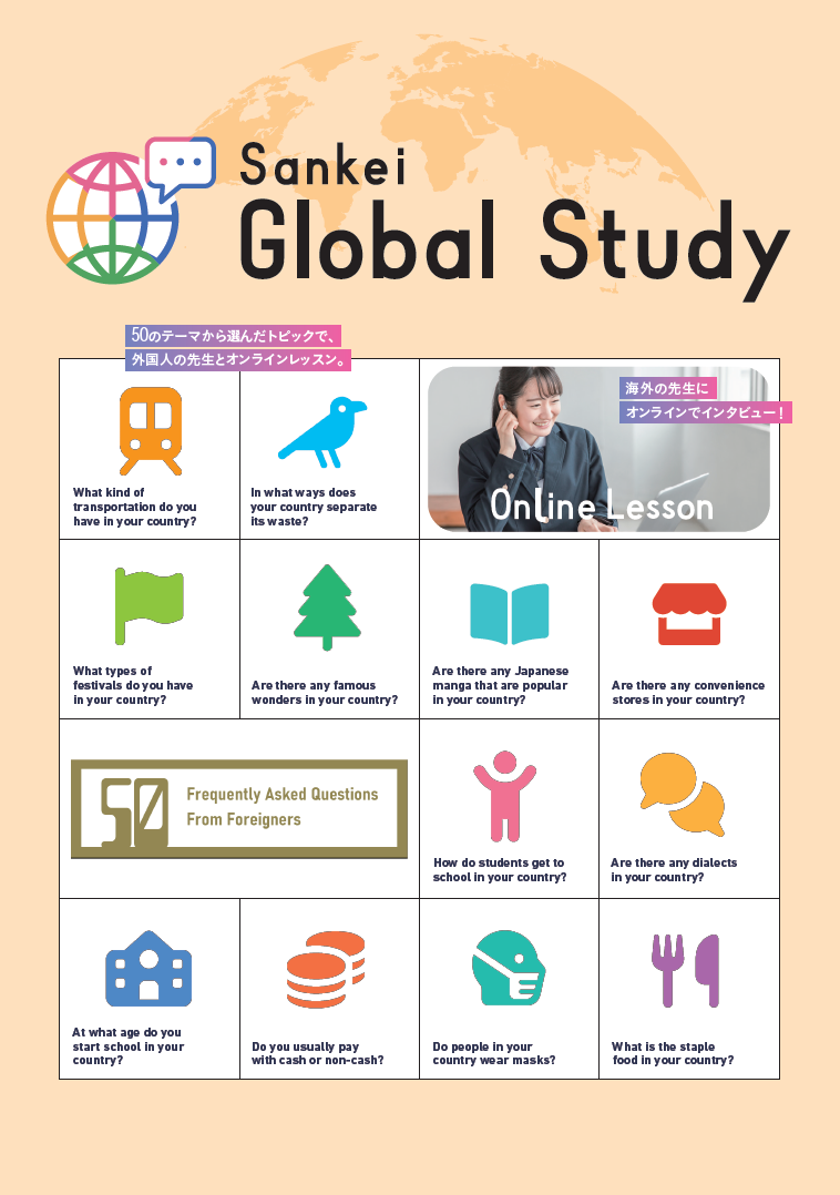 探究学習のテーマは、「産経オンライン英会話Plus」で人気のテキスト「外国人によく聞かれる50の質問」から、日本を訪れる外国人観光客や、海外で日本についてよく聞かれる質問をベースに50テーマ用意しました。