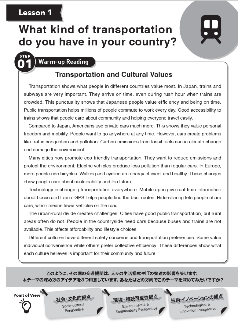 「神社とお寺はどう違うの?」「電車の中でみんな静かなのはなぜ?」「家で一番よく食べるメニューは?」など、社会・文化・自然・技術など、さまざまな切り口から、日本のことを伝える英語力を身につけるとともに、生徒自身も日本についての知識を深められます。