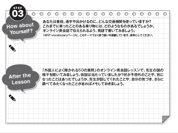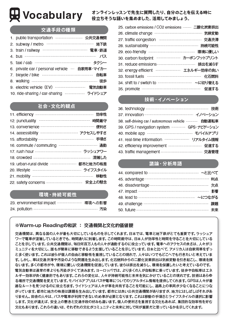 各レッスンに、テーマに関連する50語の語彙リストを掲載しました(全50テーマで2,500語)。単語を単独で覚えるのではなく、意味的なネットワークとして紐づけることで、発展的な学習を支援します。オンライン英会話ですぐに使える実践的な語彙力に加え、大学入試や時事問題への対応力も同時に高めることが可能です。