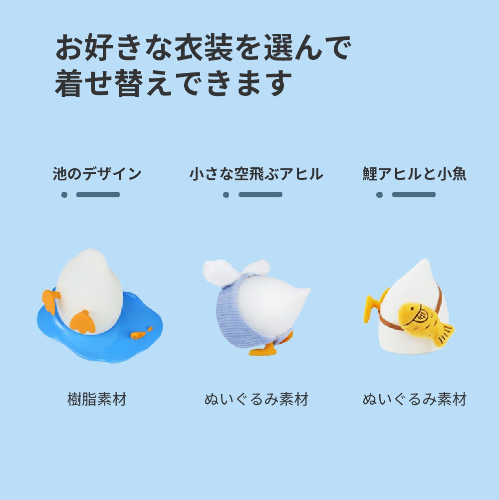 「QuackyTail(クワッキーテイル)」は、思わず触りたくなる触り心地抜群のシリコン素材と、ユーモラスなデザインが特徴の着せ替え可能なアヒル型ランプ。