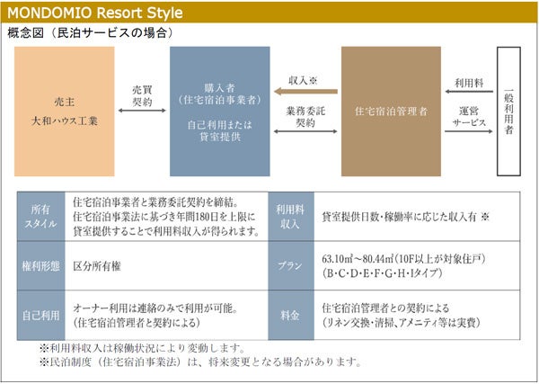「モンドミオ リゾートスタイル」は、オーナー様が住居として利用していない期間、民泊サービスとして活用できるよう、住宅宿泊管理者の紹介を行います。オーナー様が住宅宿泊事業者となり、民泊サービスを提供することで、貸室としての提供日数・稼働率に応じて賃料収入を得ることができます。また、マンスリーレンタルとの併用も可能で、永住を目的とした自らの住居利用や、二拠点生活を前提としたセカンドハウス利用だけではなく、より資産性を重視した新たな所有のあり方もサポートします。