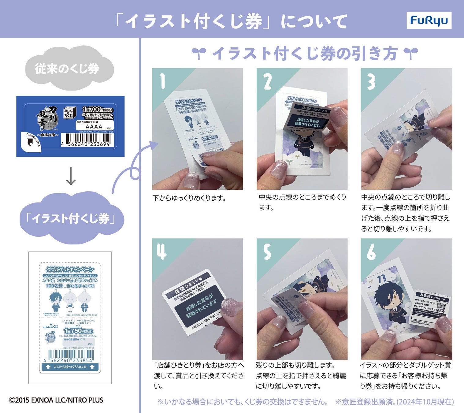 全31種類のデザイン、総勢三十一振りの刀剣男士がランダムで登場する「イラスト付くじ券」を前作に続いて採用。くじをめくった後は店舗ひきとり券部分を切り離し、キャラクターがプリントされているくじ券もお持ち帰りいただけます。是非お楽しみください。