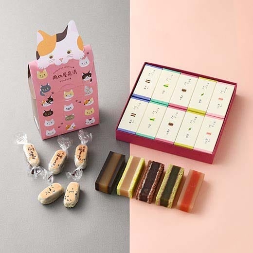 猫のモチーフのお菓子やパッケージに、グッズや伝統スイーツ、 人気銘菓をセットにしました。