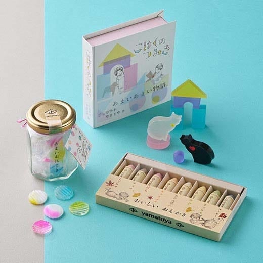 こはくのつみき ねこ1箱(15個入)・ あまいおはじき1瓶(18個入)・ おいしいおえかき1箱(8本入)