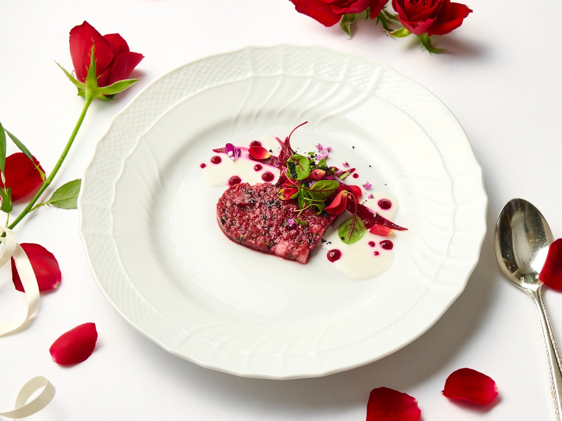 イタリアの伝統や文化を大切にし、日本の四季折々の良質な食材を組み合わせた美食体験を提供するイタリア料理「ラ ベデュータ」。シェフ 吉田 道昭がバレンタインに贈る、特別な日のテーブルを彩るハートを模った可憐な一皿「馬肉のタルタラ」は、一頭一頭大切に飼育された生産者こだわりの「みわ馬」を使用。冬野菜のビーツや山芋、広島菜のしば漬けやエシャロットなど、それぞれの素材の食感と風味が見事に調和し、フランボワーズビネガーがフルーティーな甘酸っぱさを添えます。