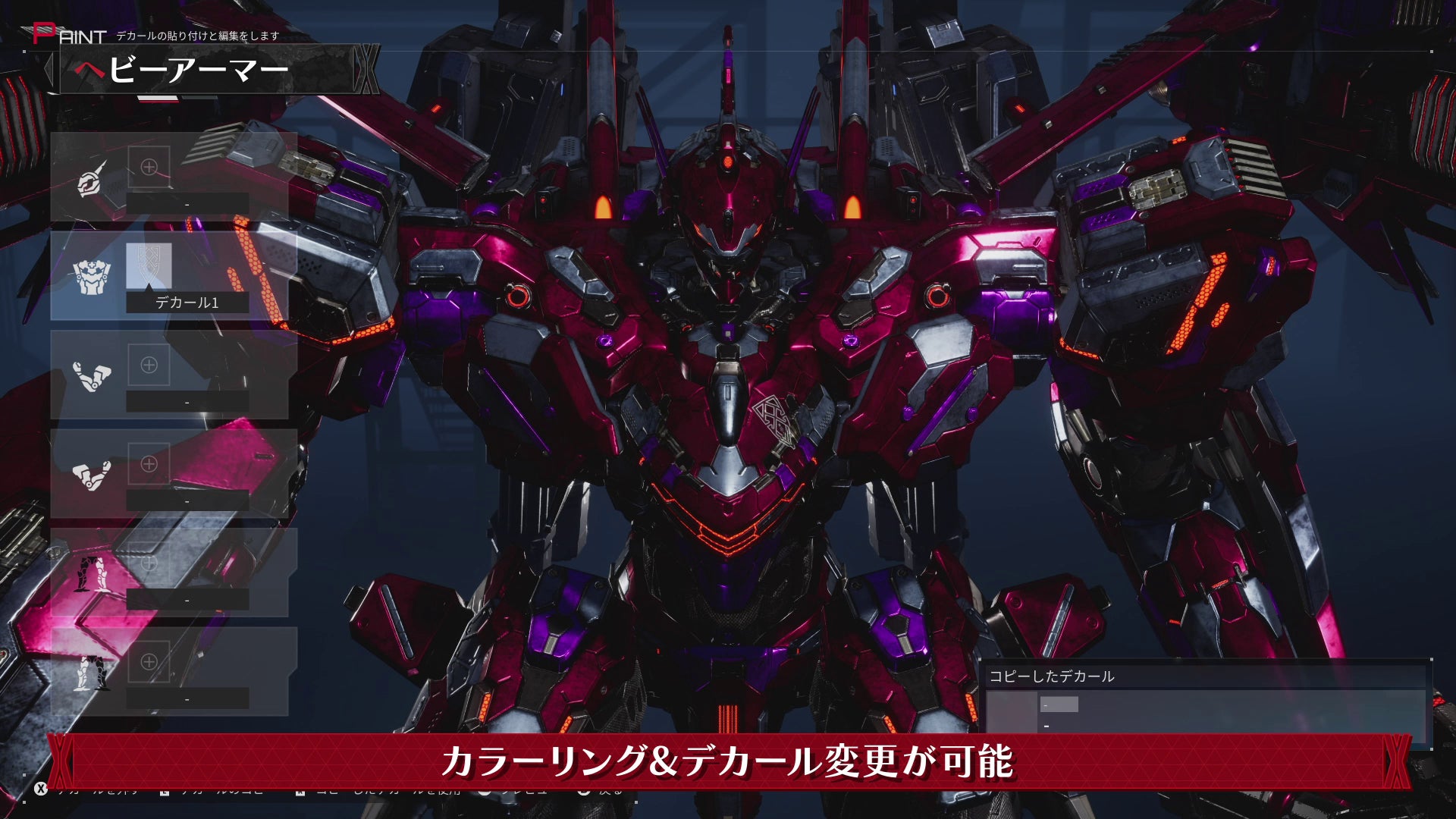 カラーリングの変更やデカールを用いて自由に見た目をカスタマイズすることができる。好みの見た目に仕上げて戦場を圧倒しよう。