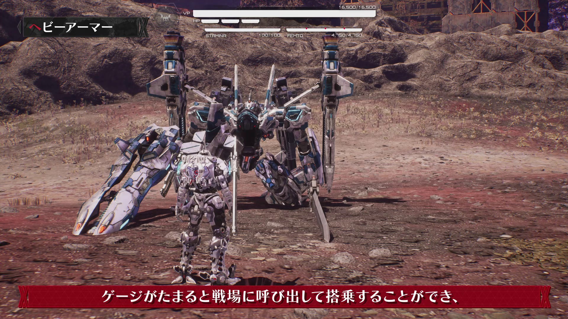 「ヘビーアーマー」は、強力な攻撃を行える外部装甲。ゲージが最大までたまると戦場に呼び出し、搭乗して操作可能。エネルギーが続く限り行動できる。