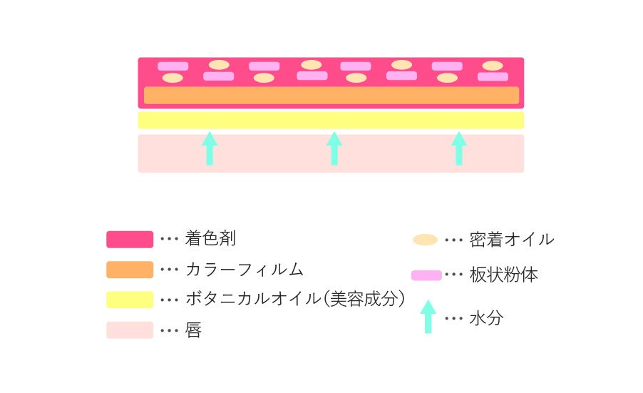 密着オイルと板状粉体をバランスよく組み合わせたことで、よれにくく均一なカラーフィルムが完成。唇ケアするエモリエントオイルとボタニカルオイルを限界まで配合し、リップバームのような保湿力でうるおいを保ちます。