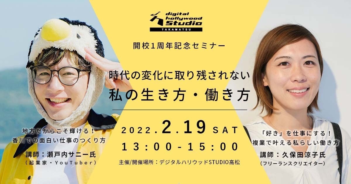 そこで今回、デジタルハリウッドSTUDIO高松の開校1周年を記念して2名のゲストを迎え、時代の変化に取り残されない生き方や働き方の実現に向けて一歩踏み出せるヒントをお話しいただきます。