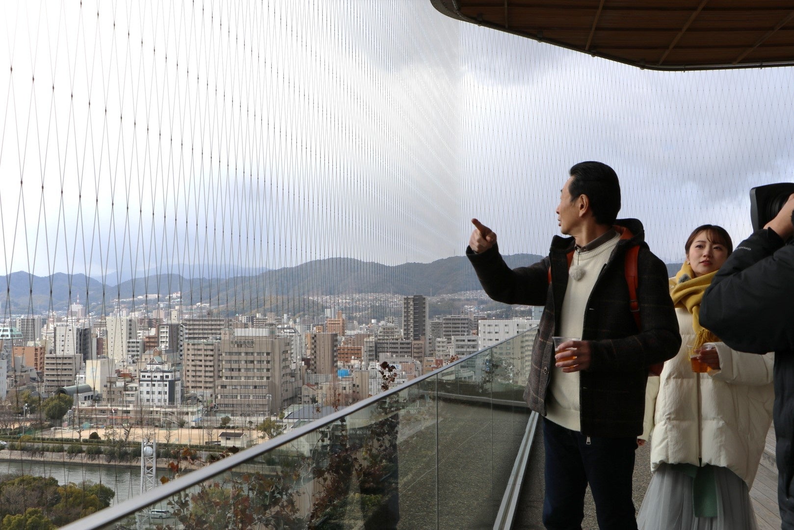 次に向かったのは原爆ドームの東隣に建つ複合商業施設【おりづるタワー】。その屋上にある平和記念公園や世界遺産・原爆ドームを同時に望めるスポット【ひろしまの丘】で景色を満喫!