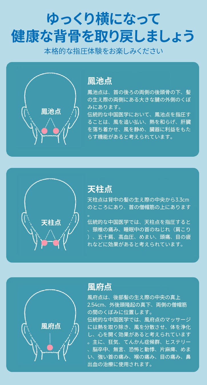 CozyNapeは人体のツボに関する中国医学の研究に基づいて設計され、あなたの首に快適なサポートを提供します。