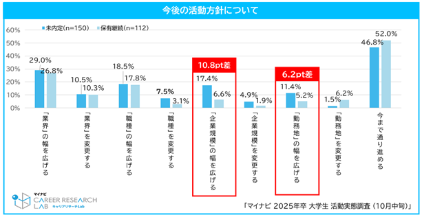 25年卒学生の10月中旬時点での内定率は90.5%(前年比4.5pt増)だった。今後も就職活動を継続する学生の活動の方向性は、未内定者と内定を保有しつつ活動を継続する学生のどちらも今まで通り進める割合が高いが、未内定者のほうが「企業規模」や「勤務地」といった条件の幅を広げるという回答が多くみられた。【図1、2】