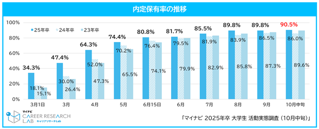 2025年卒業予定の大学生・大学院生の内定率は90.5%(前年比4.5pt増)。未内定者は企業規模や勤務地といった条件を柔軟にする可能性も【図1、2】