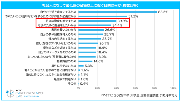 学生に、社会人になって最低限の金額以上に稼ぐ目的を聞いたところ、最も多かったのは「自分の生活を豊かにするため(82.6%)」、次いで「やりたいこと(趣味など)をするためにはお金が必要だから(51.2%)」となった。一方で「将来の資産を増やすため(39.9%)」「老後のために貯金をしたいから(34.4%)」といった、将来に備えるための回答も多くみられた。9月の調査※で学生の将来の不安をきいたところ、「老後の貯蓄(生活費)が足りない(39.4%)」が最多だったため、将来の不安感からこうした回答が多くみられたと考えられる。【図7、8】