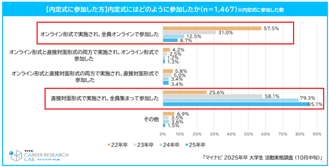 内定を保有している学生に内定式について聞いたところ、66.5%の学生が「10月1日に内定式があり参加した」と回答した。内定式の形式については「対面形式」が85.1%で、ほとんどの学生が対面で参加したことがわかった。一方で「オンライン形式」での開催は昨年が12.5%だったのに対し、今年は8.7%と1割を切る結果となった。コロナ禍以降、オンライン形式での開催は年々減少し、対面形式での開催が主流になっていることがわかる。【図3、4】