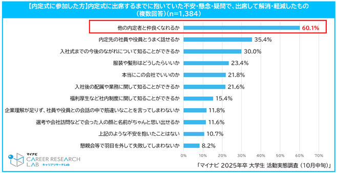 内定式に対面で参加した学生に感想を聞いたところ、「同期と実際に会えてよかった(78.5%)」が最多で、次いで「来年からその会社で働く実感がわいた(59.0%)」となった。内定式に参加することで解消された不安は「他の内定者と仲良くなれるか(60.1%)」が最多で、対面での内定式は学生の不安解消のフォローとなっていることがうかがえる。【図5、6】